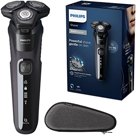 The Philips 5000 Series Men's electric razor gently slides your skin and ensures a smooth shave. This electric shaver is equipped with a smart beard sensor that captures hair density 125 times per second and automatically adjusts its performance for an easy and gentle shave. The self-sharpening SteelPrecision blades and 360° rotatable flexible head ensure optimal skin contact and water resistance for use in both wet and dry conditions, ensuring a thoroughly comfortable shaving experience. The device comes with a clamshell that flushable with water, as well as an intuitive display, a cleaning device, a travel lock indicator, a built-in trimmer and a travel box. At Philips, sustainability is important in all aspects of product production. Our production equipment uses 100% renewable energy to make blades and our packaging is made from recycled materials. All razors come with an eco-passport. Charging time: Fully charged after 1 hour.