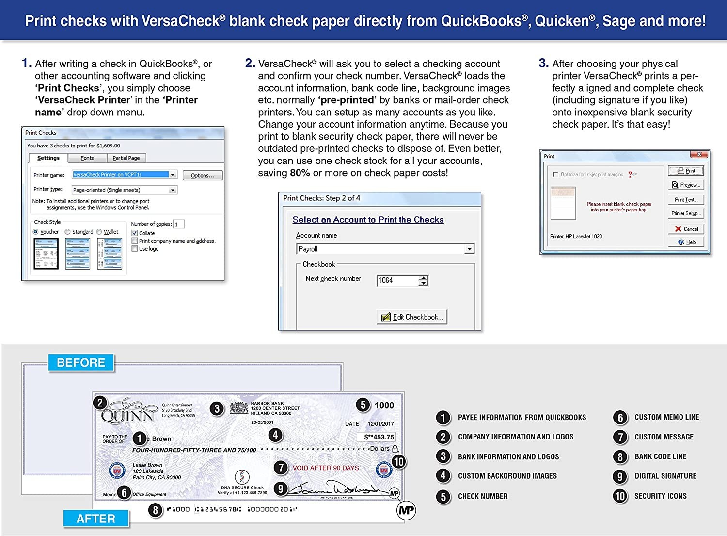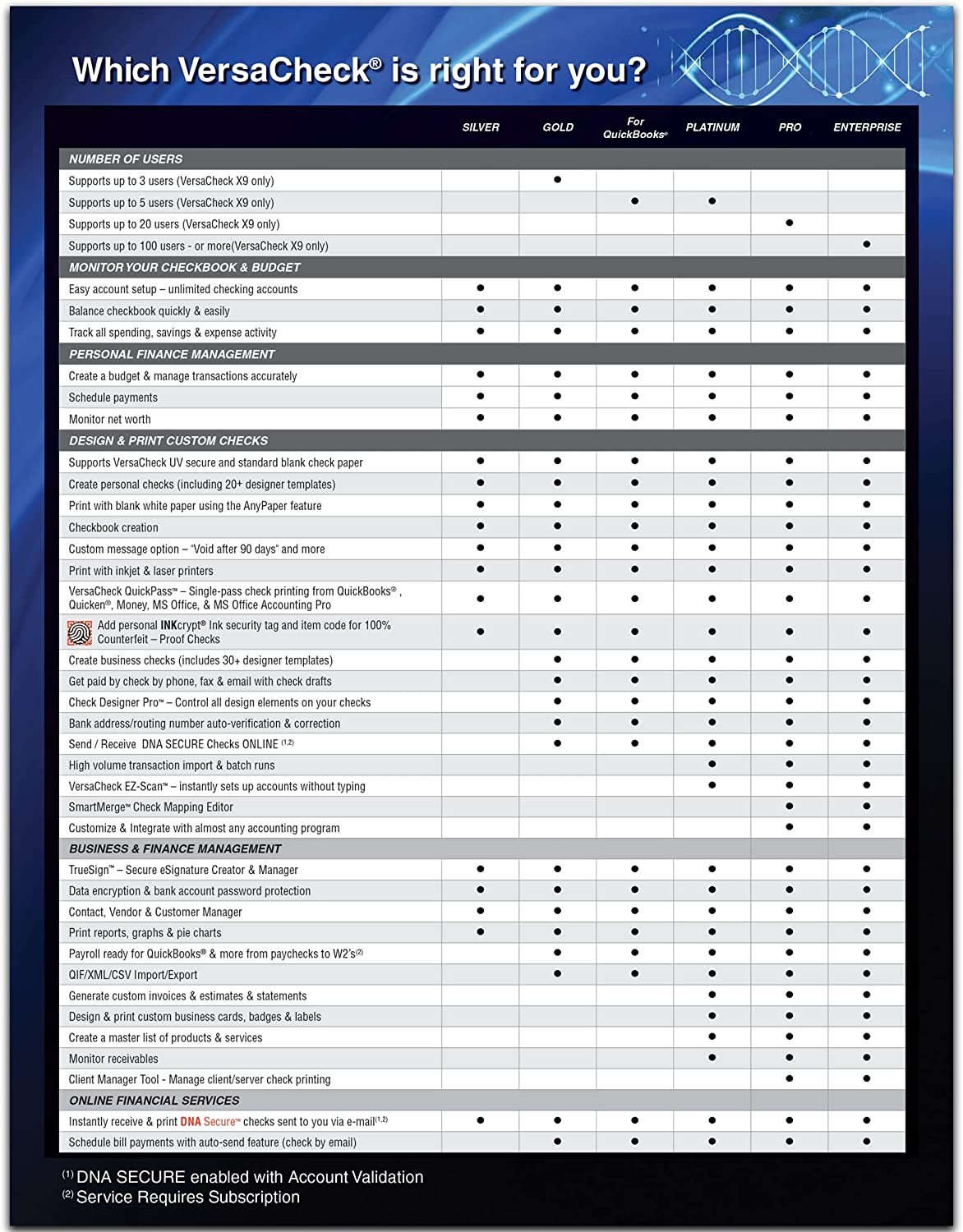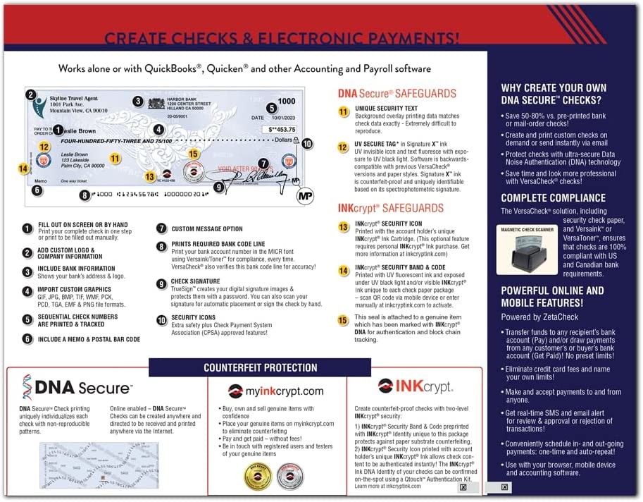 • Includes VersaCheck Software Download, License for 100 Users, and 165 Print Validation codes. Additional print codes included FREE in VersaCheck Check Paper packaging.